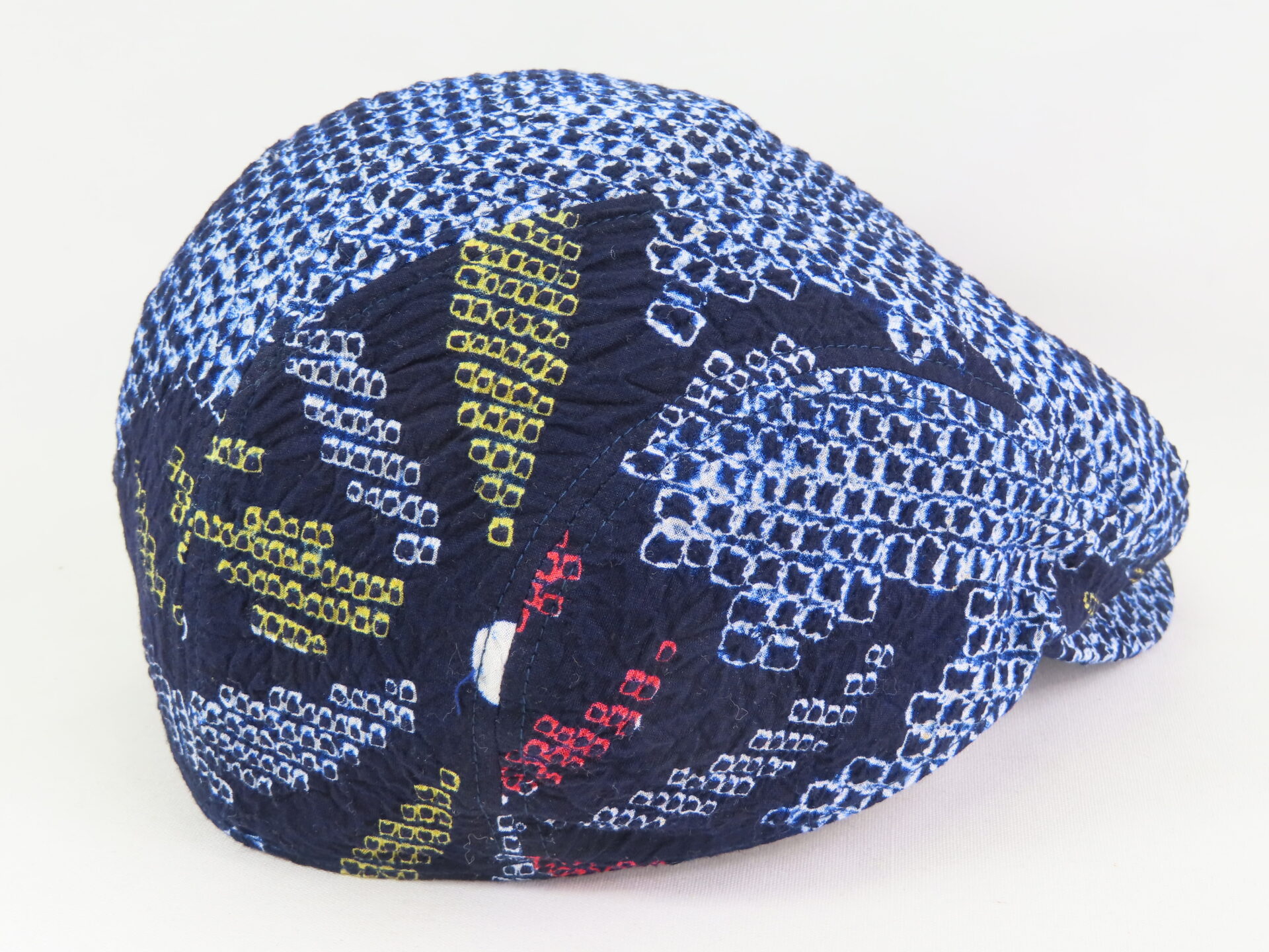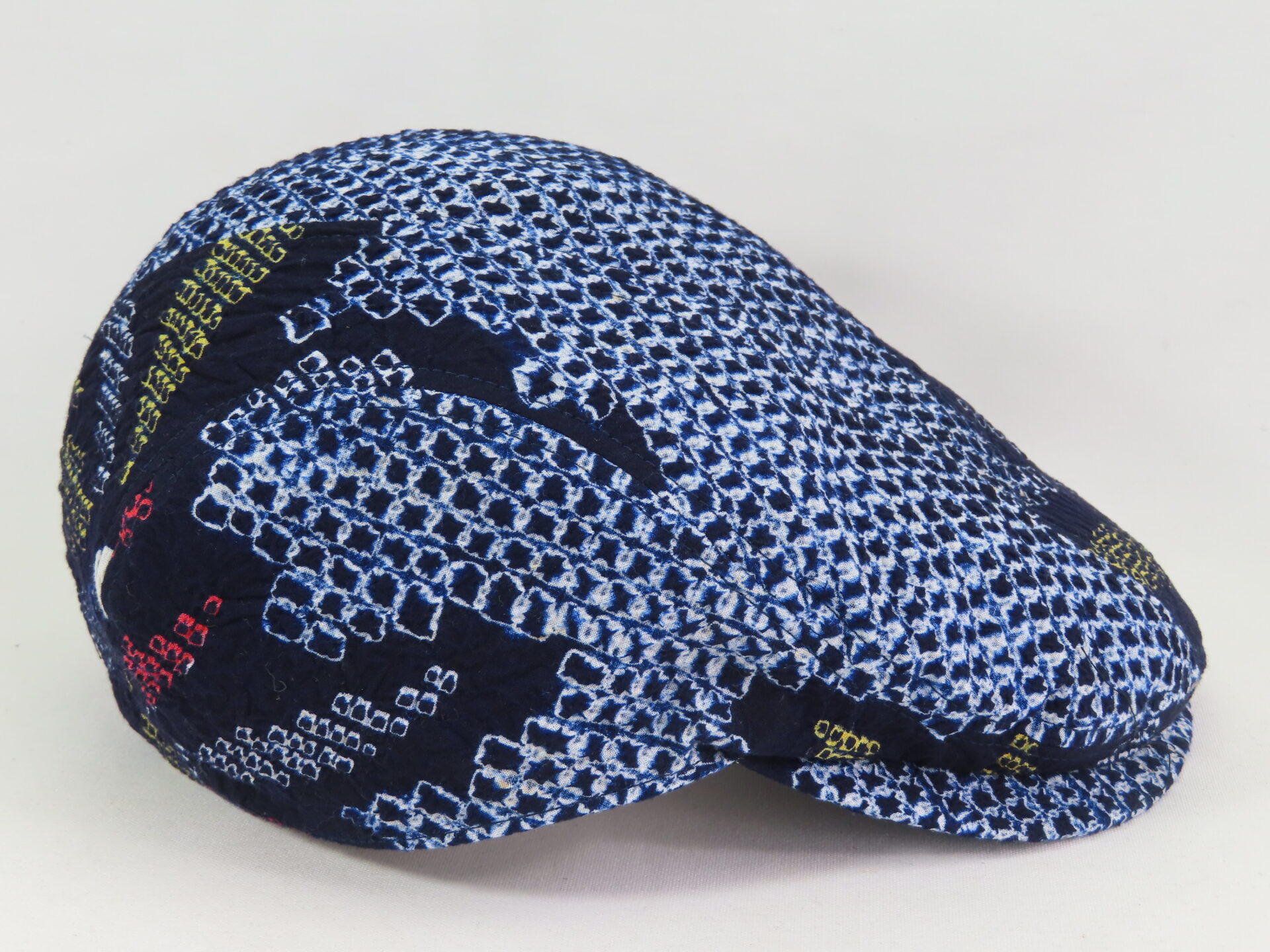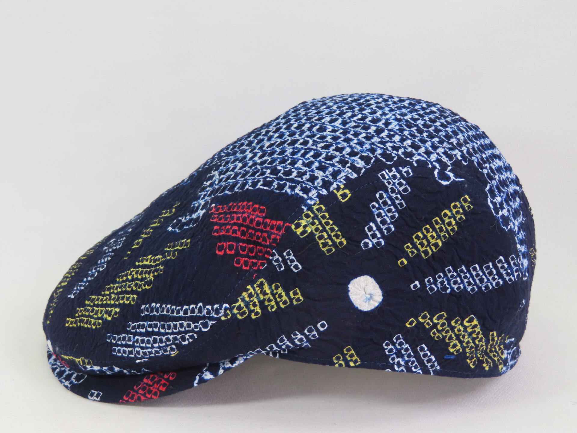 紺ベースの三浦絞と赤色・黄色・紺色に染めた花弁の華やかな演出した浴衣生地を使いハンチング帽子にしました。