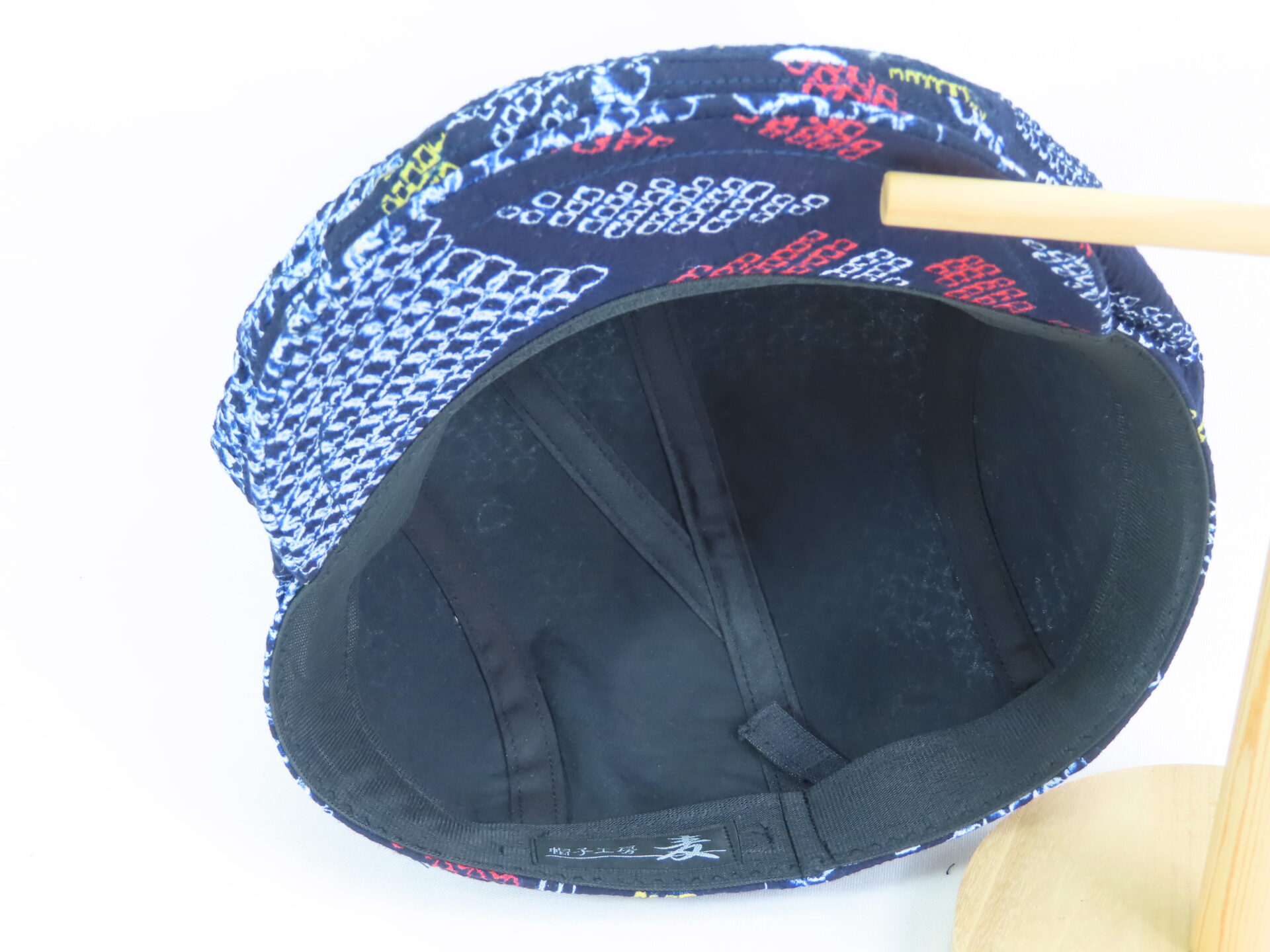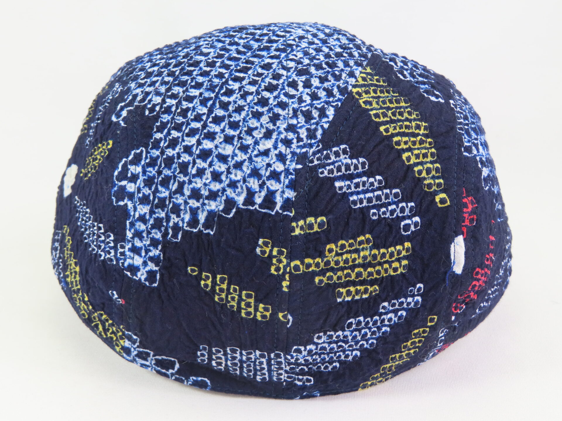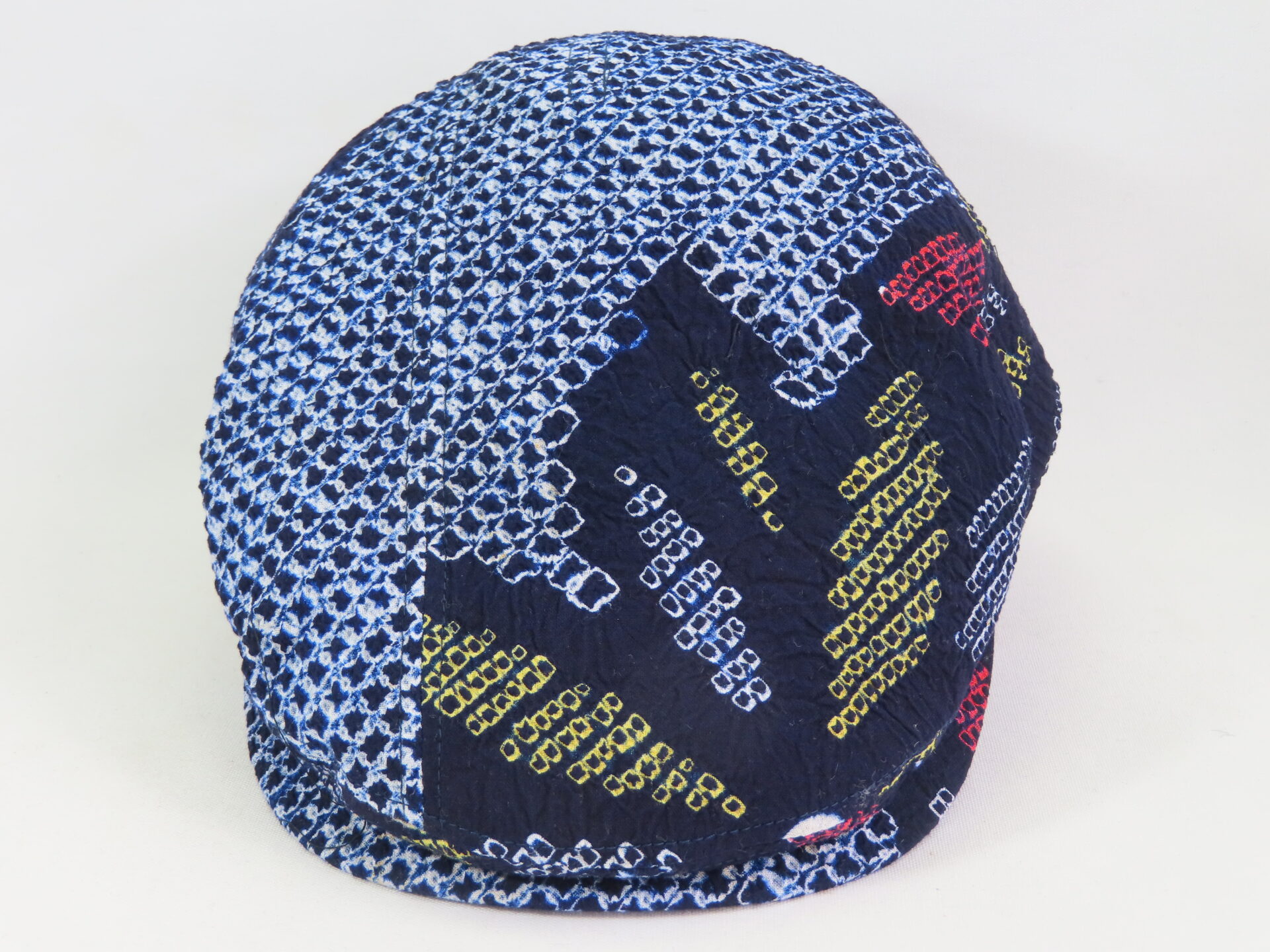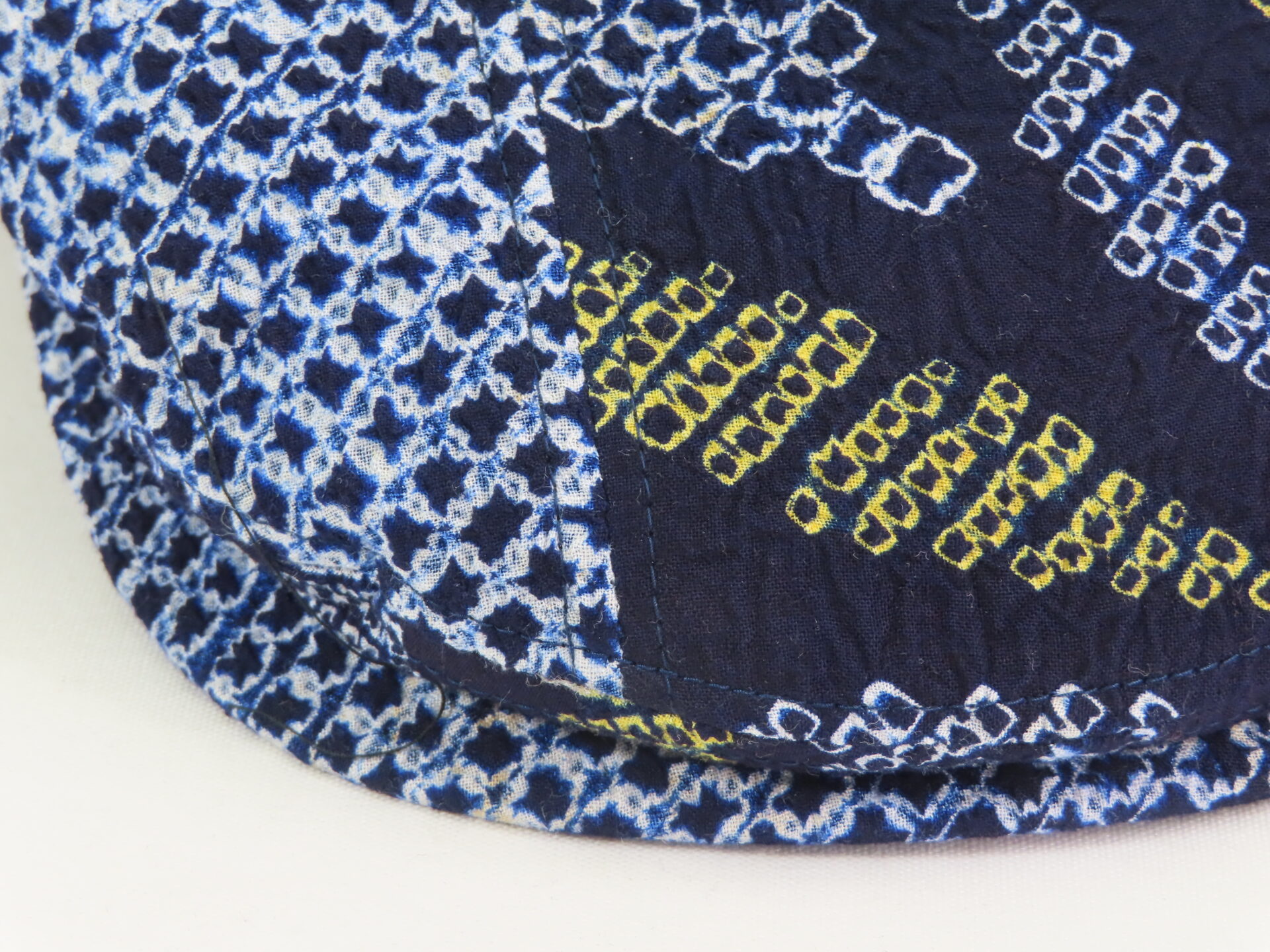 紺ベースの三浦絞と赤色・黄色・紺色に染めた花弁の華やかな演出した浴衣生地を使いハンチング帽子にしました。